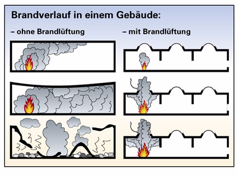 Im Brandschutzkonzept ist eine der wichtigen Einzelmaßnahmen die Rauch-& Wärmeabzugsanlage (RWA). Sie dient der Brandlüftung und hat die Aufgabe, Rauch uns Wärme aus dem brennenden Gebäude abzuführen, die Audbreitung des Brandes zu verzögern und bereits vor dem Eintreffen der Feuerwehr die Vorraussetzung für die Rettung von Menschenleben und eine Wirksame und gezielte Brandbekämpfung zu schaffen. Ein Brand in einen gebäude verläuft grundsätzlich anders als ein Feuer im Freien. Jedes Feuer setzt Wärmeenergie frei. Ei geringer Anteil dieser Energie wird durch Wärmeleitung weitergegeben, d.h. der Boden rund um das Feuer wird wärmer. Ein Anteil von 20-30% wirkt als Strahlungswärme, die in unmittelbarer Nähe eines Feuers zu spüren ist. Der Hauptanteil der Wärme, nähmlich 70-80% steigt als Konvektionswärme nach oben.